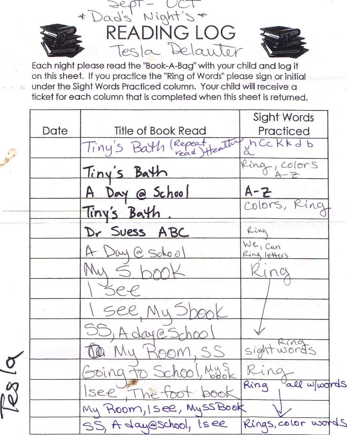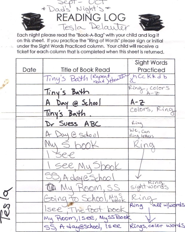 After requesting her bookbag again, I find inside her reading log.