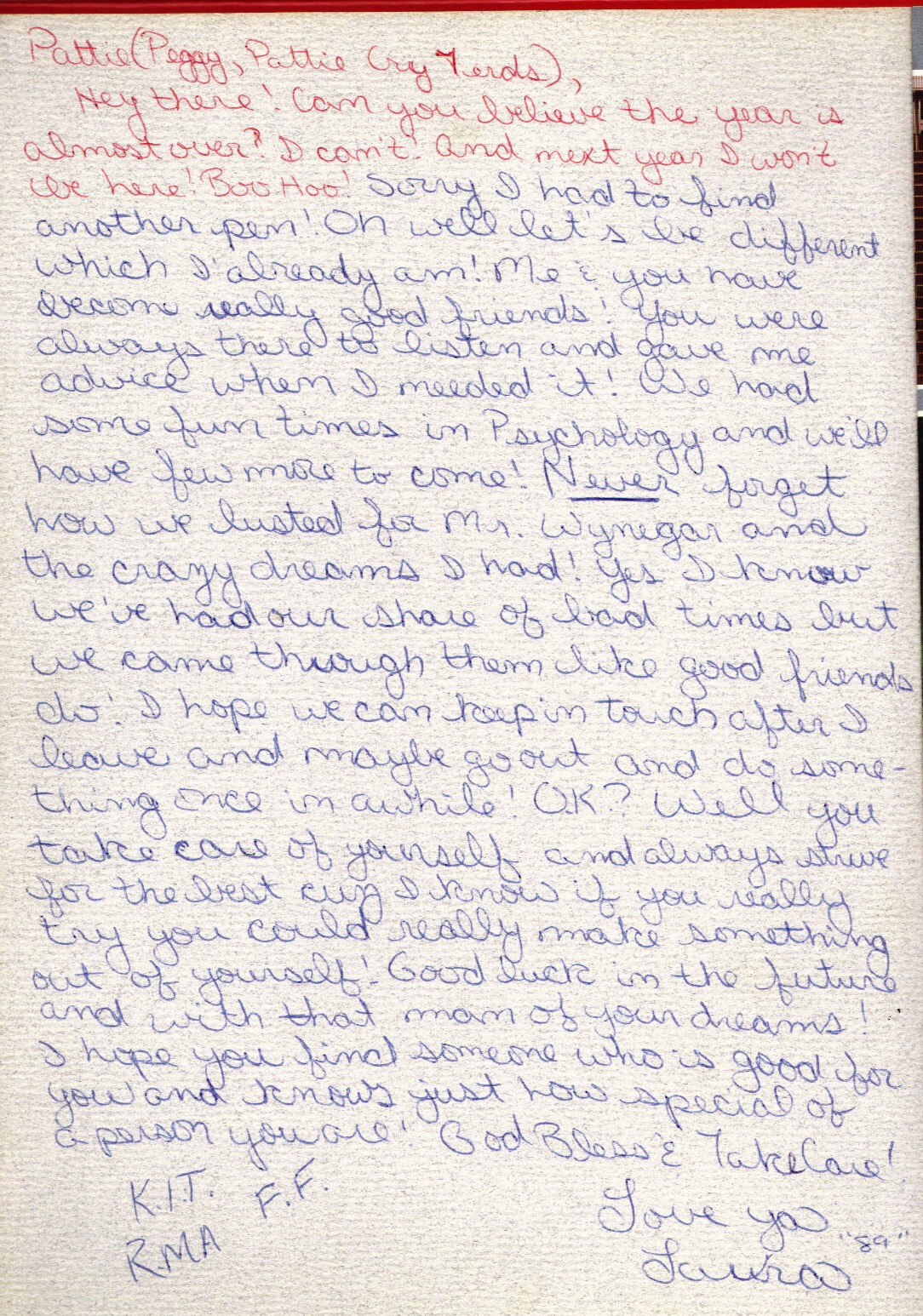 Hey, only one more crazy year! Yea! How did we make it this far? Lunch was great, you never failed to make it interesting, gross, thrilling, fun, etc. and sometimes all at once! I’m so glad we had some good long talks. We’ve got to have more of them. You’ve helped me through some depressing times; Thanks! You know you can talk to me whenever and believe it or not I’ll understand!!!