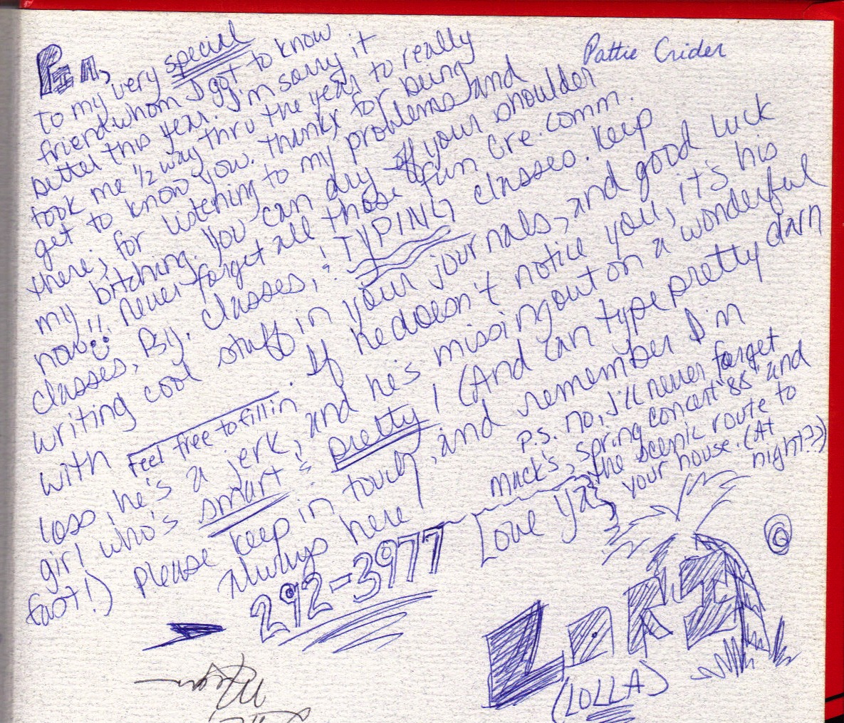 Finally, I have a little time to write about highschool days and the people who signed my yearbook in 1986 or . This summer math course I’m taking at York College covers 15 weeks of material in 5 weeks. My sister Suz says I’m crazy for taking summer courses, but I have a 98% so far!