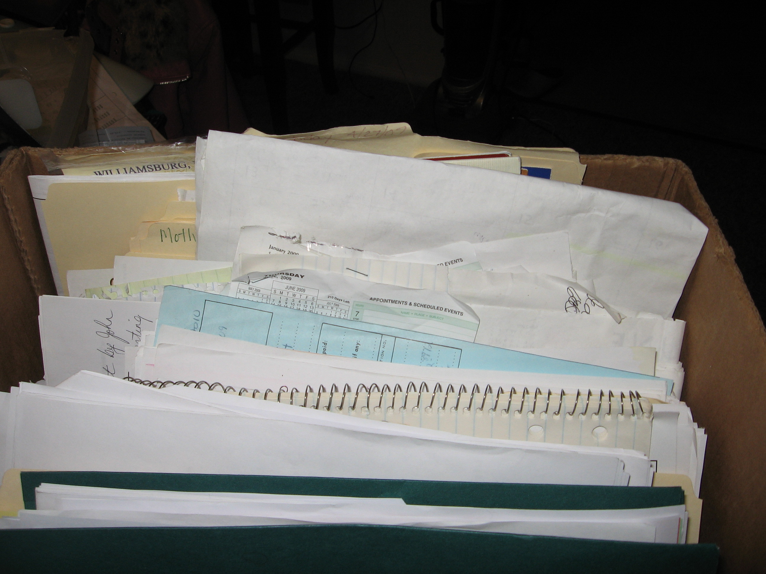 Here’s the intimidating pile of journal records. The banana box has room for more. I never know where I will find piles of journal pages.