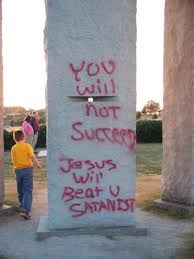 Not long after the publication of his book, Phyllis Brooks who runs the Elbert County Chamber of Commerce remembers when the Guidestones were attacked by vandals for the first time ever.  The message spray-painted on one tablet was “Jesus will beat u Satanists.”  Dice denied any involvement in the assault of the stones.  Other defacements asserted that the Council on Foreign Relations is “ran by the devil,” and the September 11, 2001 attacks were an inside job headed President Obama, who is a Muslim.  Vandals have also splashed the Guidestones with polyurethane, which is much more difficult to remove than paint.  Despite the graffiti artist’s alignment with his views, Dice says he disapproves of their acts.