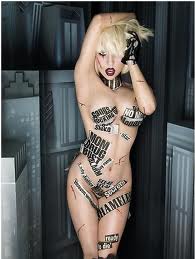Lady Gaga explains, “The Lord GA has been commonly recognized as “God” in many, but not all faiths.  I pray to GA everyday and ask for guidance.  At night I dream the most wicked and horrible nightmares.  These dreams are messages from GA.  I see the wickedness of the people on earth and must share these dreams with you in my works of art.  If I must cover my naked body with the social issues of the world, I will.”