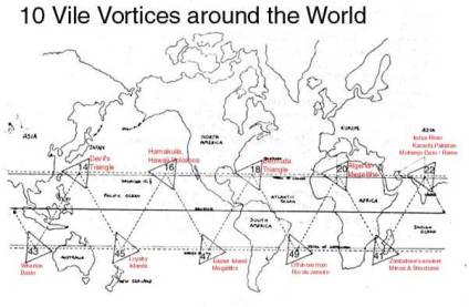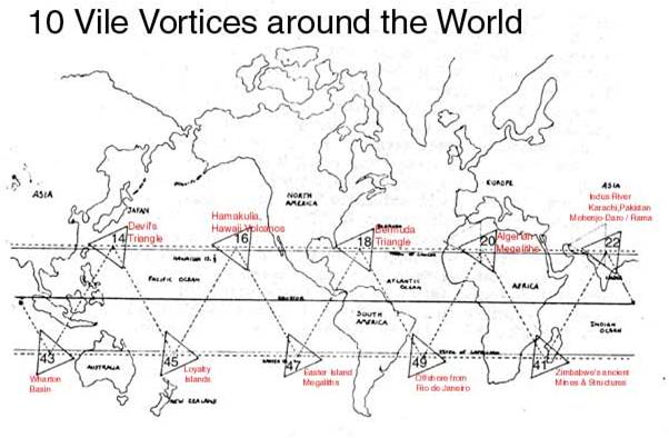 Triangles: Warn of danger to humans.  An example would be the Devil’s Triangle located in the band of vile vortices along the equator.  Ten of these triangular vortexes exist worldwide.